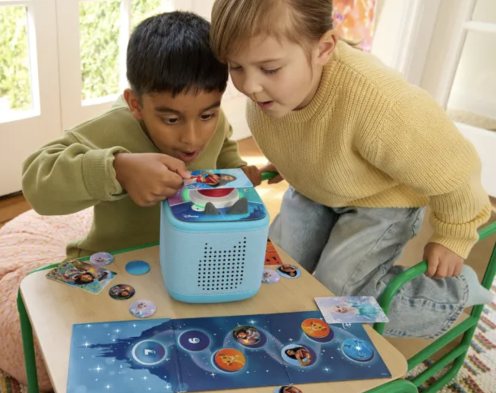 - Le concept : On pose une figurine (un « Tonie ») sur le dessus de la boîte et l’histoire démarre immédiatement. On tape sur les côtés pour changer de piste.