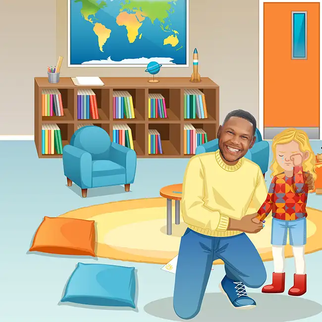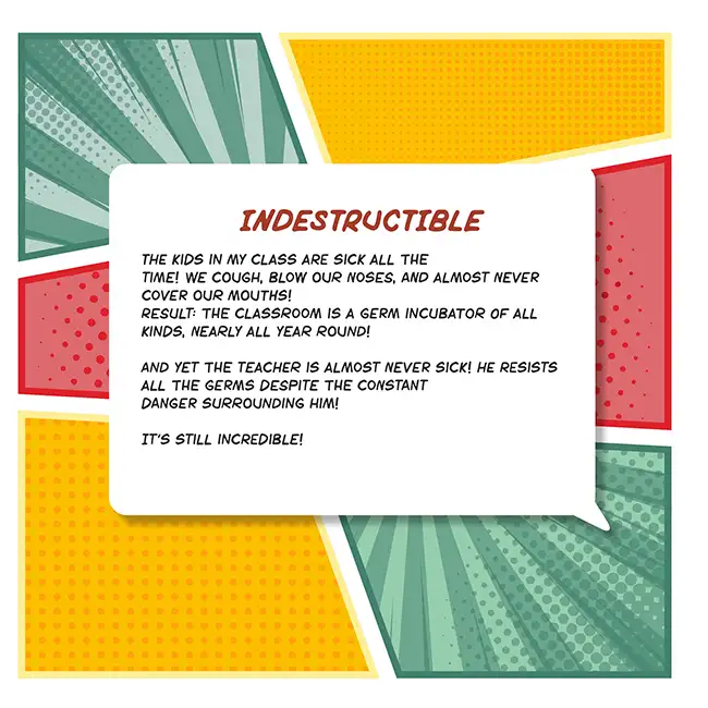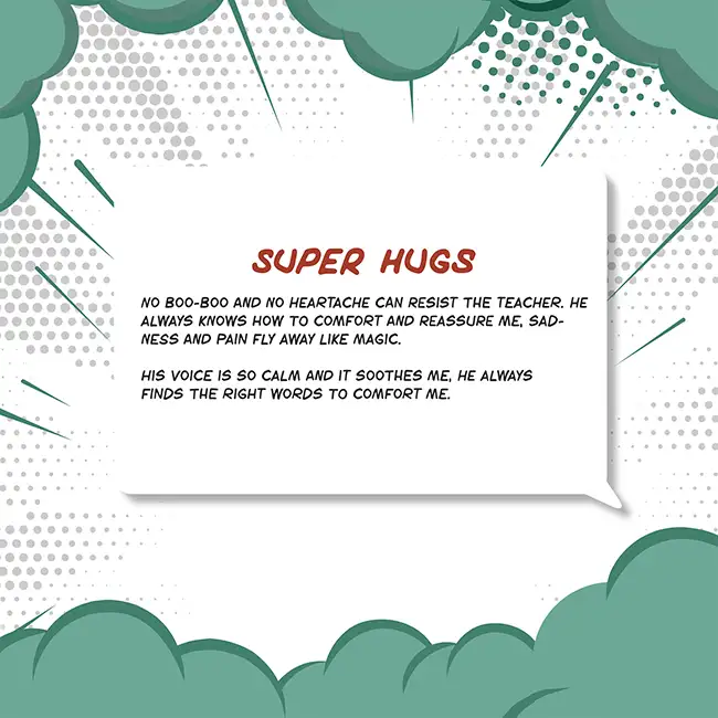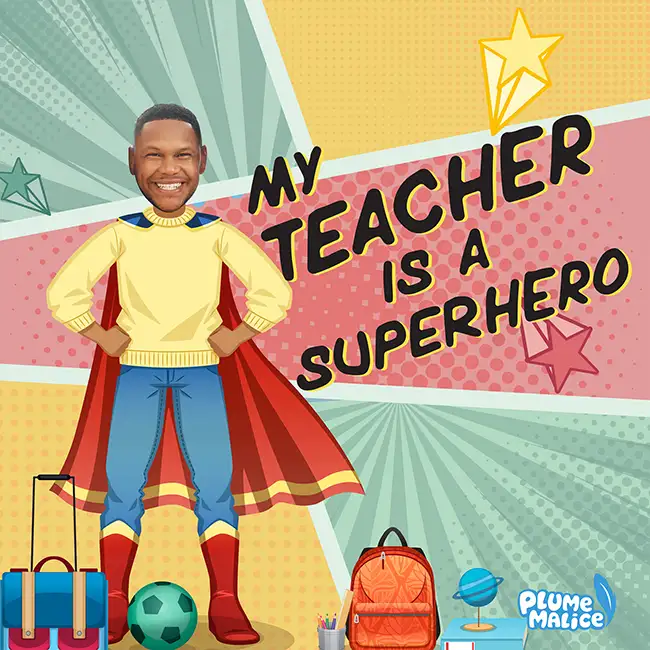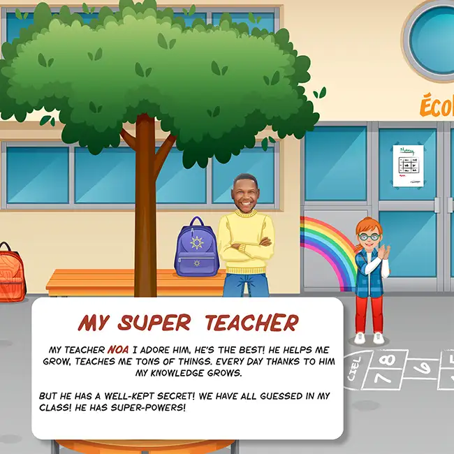 Add your child’s teacher’s photo, and his story begins. His photo is integrated into the book, and his name appears on every page. As the chapters unfold, your teacher discovers unexpected superpowers: powerful, funny, and perfectly fitting for who he is.