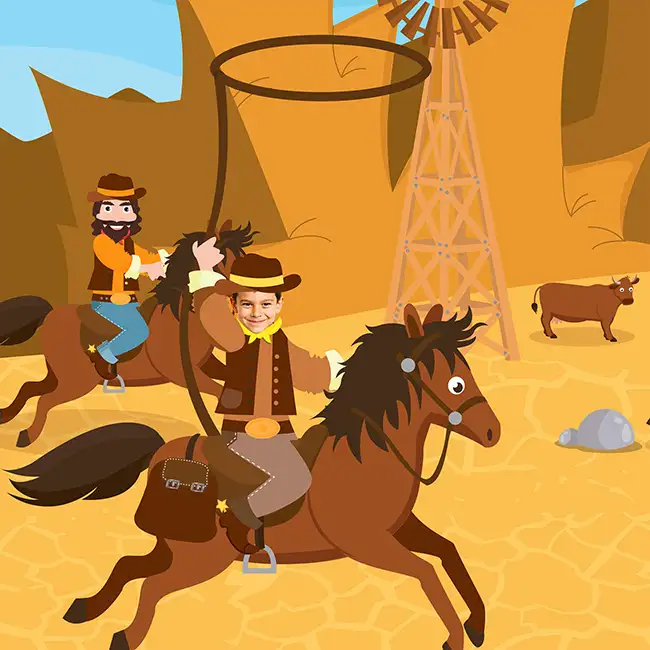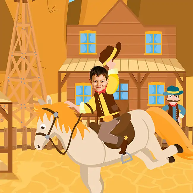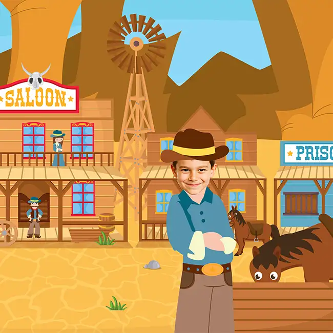 In Out West, your child takes centre stage in the heart of the Wild West: hat on, mission in hand, and their face throughout the story. Add their photo, enter their name, and watch them step into the role of a cowboy like no one else can.