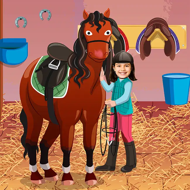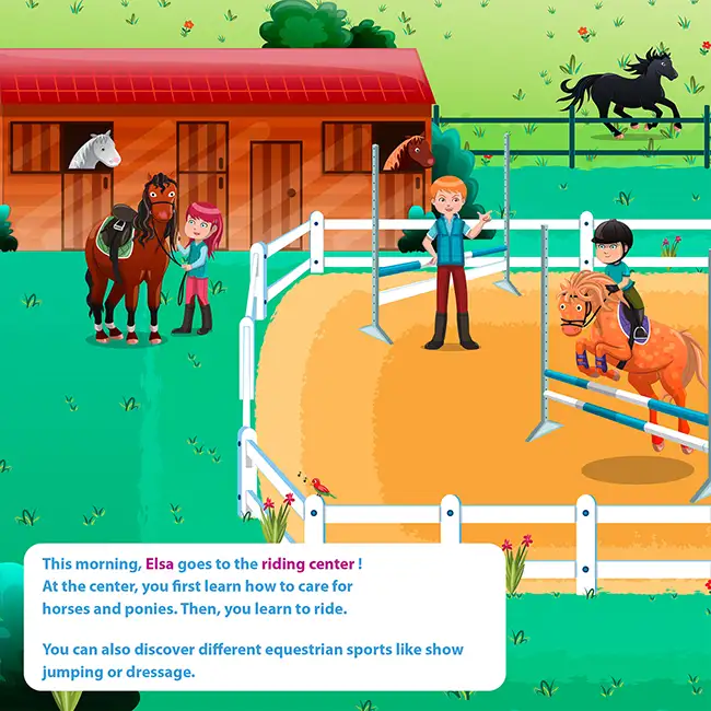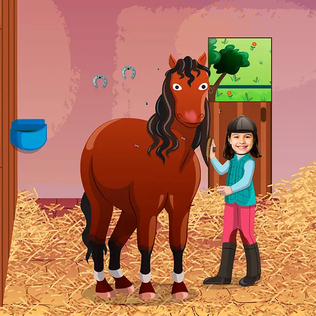 In At the Equestrian Centre, your child spends a full day among horses and ponies. The stalls need cleaning, the horses need brushing, the ponies need feeding... And with help from the instructor, she learns jumping and cantering to become a true rider. Her name and her face appear on every page of the adventure.
