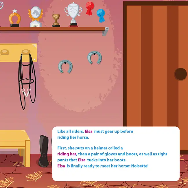 Cleaning stalls, brushing horses, feeding ponies, learning jumps and cantering... A day at the equestrian centre told from the inside, page after page. Your child discovers the world of horseback riding from every angle. And her name is there at every turn.