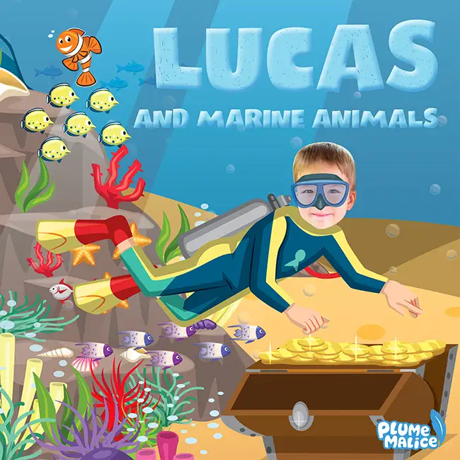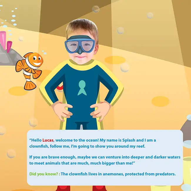 The clownfish leads your child from one encounter to the next through warm reefs and deep waters. Dolphins, beluga whales, rays... Each animal reveals its secrets. Your child discovers the ocean in a whole new way, with their own face in every illustration.