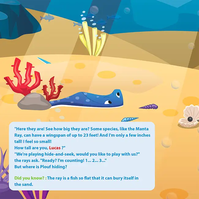 In Under the Ocean, your child dives into warm reefs and explores the seafloor alongside around ten aquatic animals. Their names, what they eat, how they live... Every encounter is a new lesson. And their name and photo appear on every page.