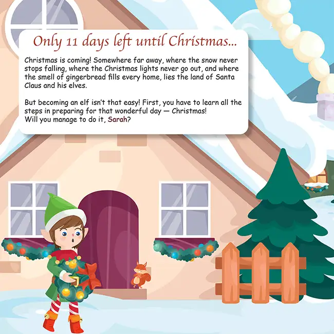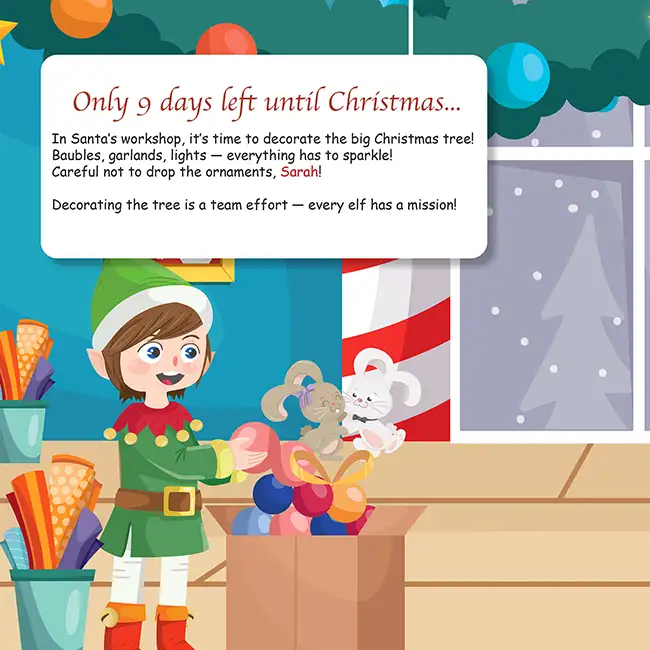In Christmas with the Elves, your child is not waiting for Christmas from the sofa. He is helping make it happen. You will find him in the kitchen baking biscuits, in the stable caring for the reindeer, and side by side with the elves loading the sleigh. His photo is on every page, and everyone in the workshop knows his name. The story is his, from the first snowflake to the last wrapped gift.