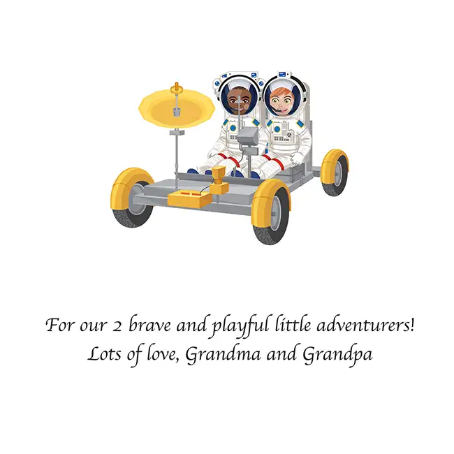 Two suits, two helmets, one goal: explore space. In this book, your two children lift off together aboard the same shuttle, with their real photos and names on every page. Because some adventures are better shared.