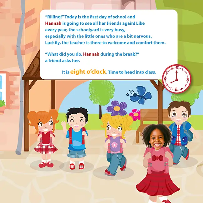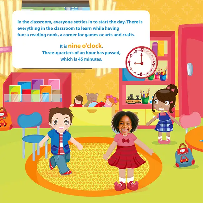 A personalized book with a photo and name is great. A personalized book with a photo and name where your child also learns how to tell time is even better. The story takes them from the classroom to the cafeteria, with recess in between, and on every page their face and name remind them that they are the hero of this day.