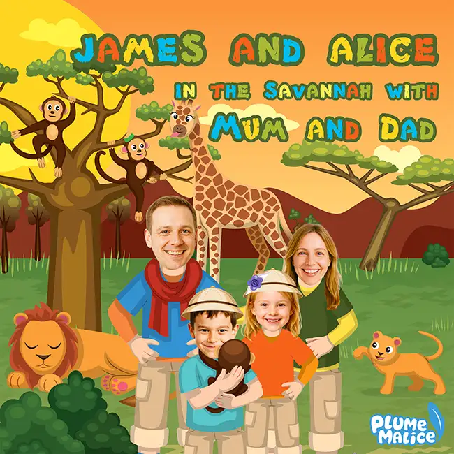 Upload your child's photo, plus the photos of the female adult and male adult they choose, add their names and a personal dedication, and all three are right in the heart of the African savanna. The book is made in France, with thick glossy pages that hold up to enthusiastic rereads. Because when three people are heroes of the same book, no one feels left out.