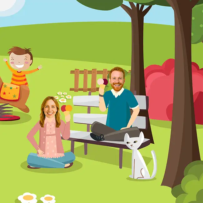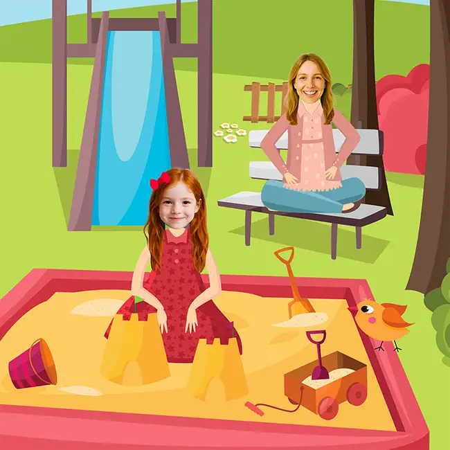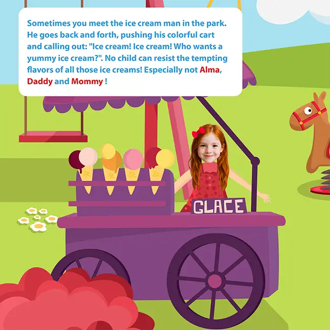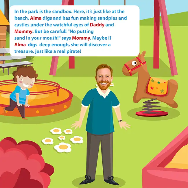 We add the child’s photo and the photos of their two grown-ups. Enter the child’s first name and each adult’s preferred name: Mom, Dad, Grandma, Grandpa, or even a first name. The text adjusts automatically, and throughout the pages, their trio appears again and again, recognizable from the very first illustration.